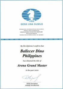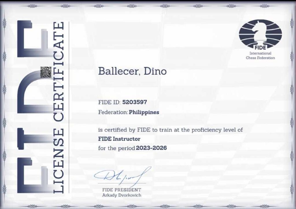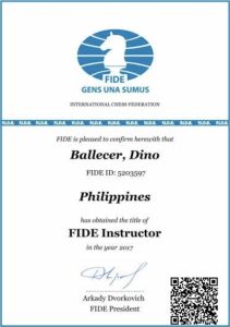 Dino Ballecer, aka Coach Dinosaur is a FIDE Master and a Certified FIDE Instructor since 2017 up to present, with a FIDE rating of 2372. He has developed a system of chess coaching and training that has achieved a level of success.